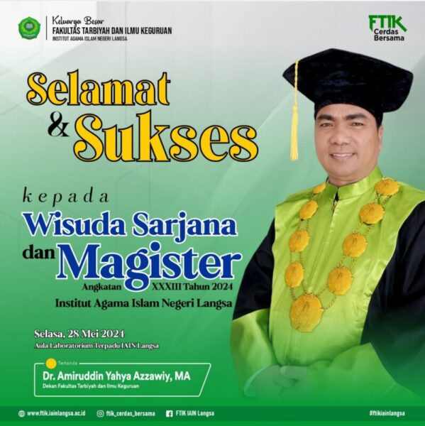 SAYA, sebagai Dekan FTIK IAIN Langsa mengucapkan “Tahniah untuk Sarjana atau lulusan FTIK. Semoga menjadi sarjana yang maslahat untuk agama, bangsa dan negara.