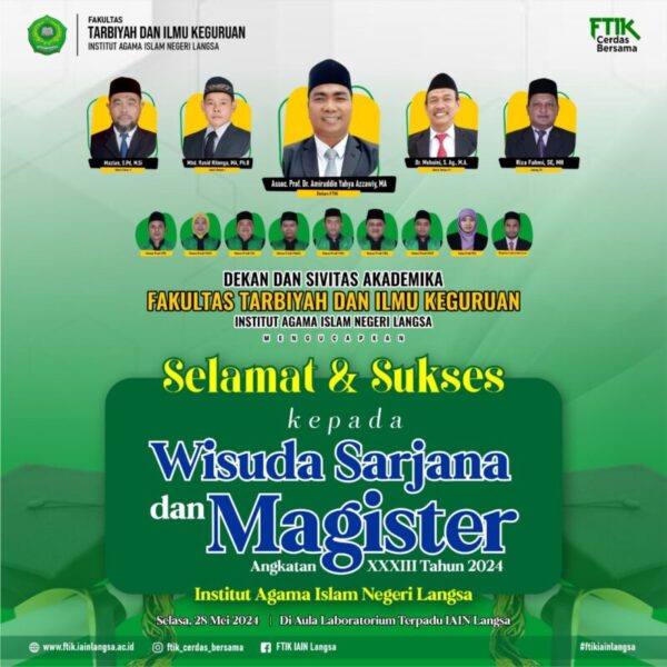 SAYA, sebagai Dekan FTIK IAIN Langsa mengucapkan “Tahniah untuk Sarjana atau lulusan FTIK. Semoga menjadi sarjana yang maslahat untuk agama, bangsa dan negara.